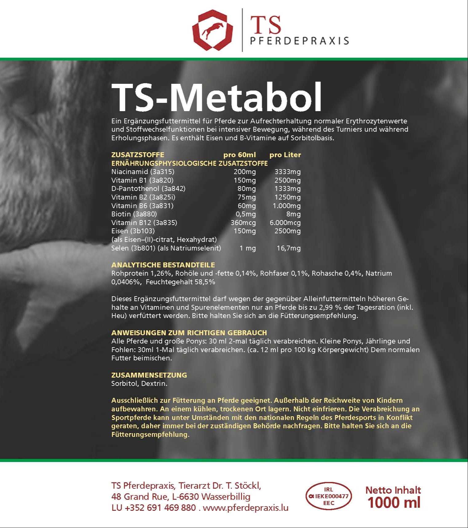 TS-Metabol liefert eine hochkonzentrierte Kombination aus B-Vitaminen, Sorbitol und wichtigen Spurenelementen. Diese Zusammensetzung unterstützt gezielt den Energiestoffwechsel, fördert die Vitalität und trägt zur schnelleren Erholung nach Anstrengung bei.